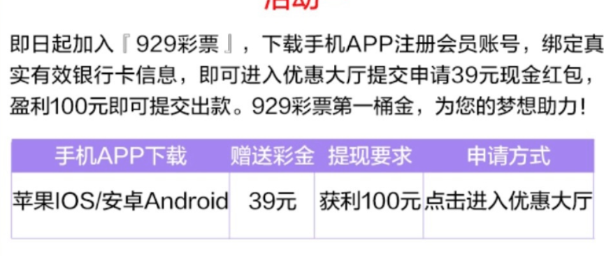 活动详情:新用户注册完善个人信息 下载平台APP点击活动中心自助申请39彩金 满100即可提现!最高提款一百