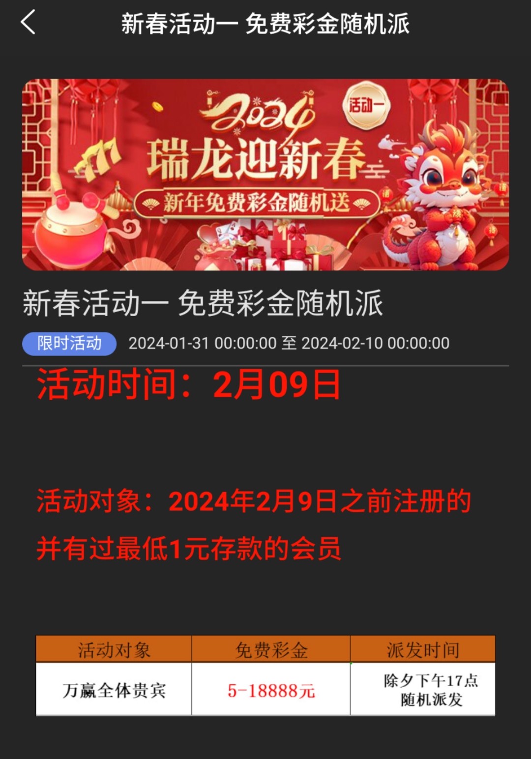 活动详情:2.9号之前注册充值过的9号送最低5元彩金