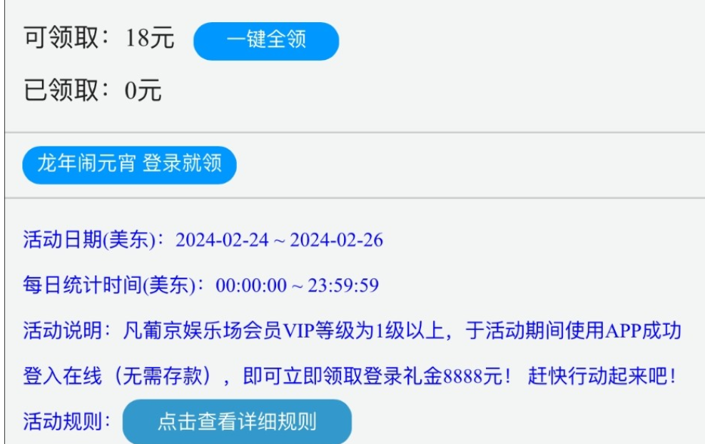 活动详情:元宵彩金,vip1才能领取,可以领取三天!