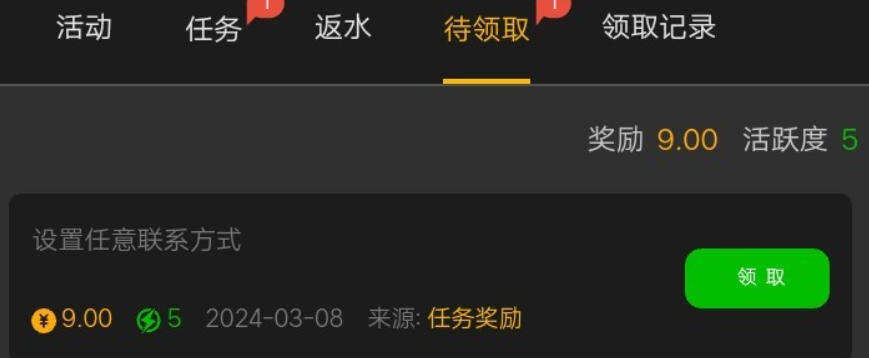 活动详情:注册绑定银行卡,完善资料,然后到任务哪里就可以领取,出款上限188,人人都有,出款自测